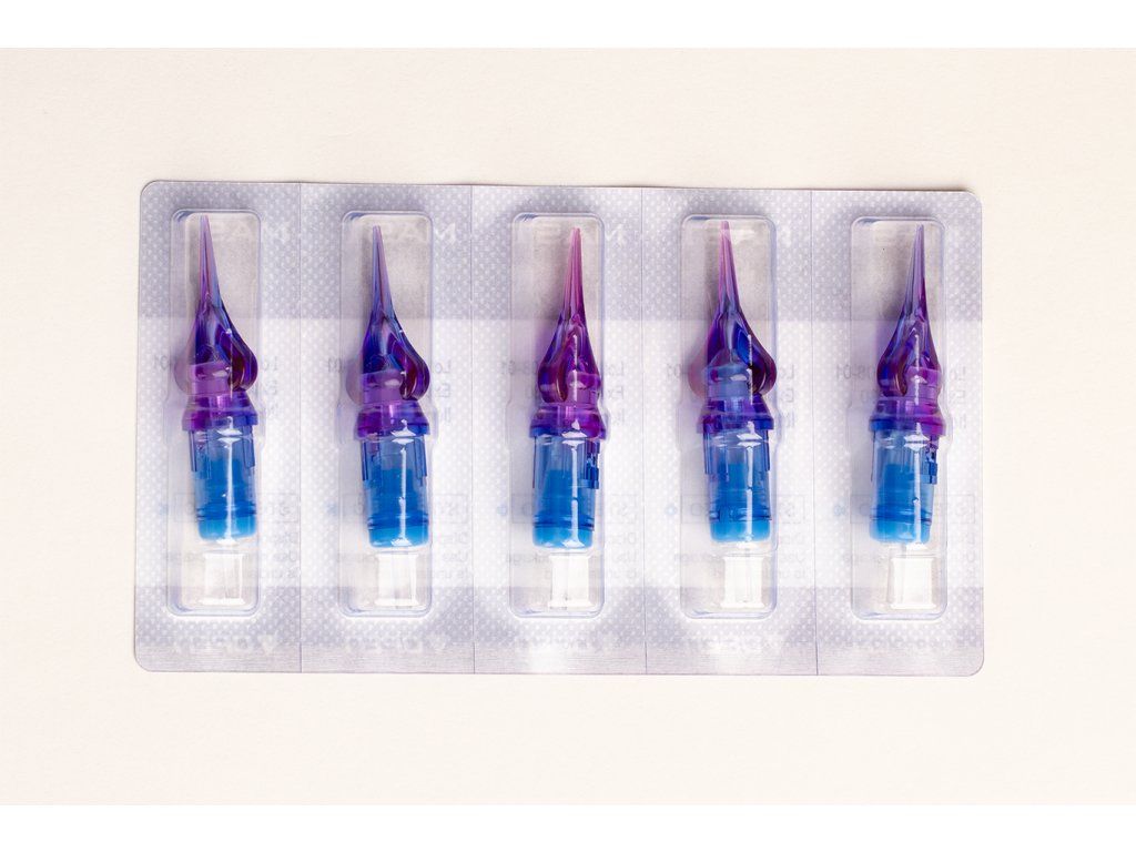 Jde o absolutně nejpoužívanější typ jehly v moderním permanentním make-upu, protože je nejuniverzálnější. Protože je jehla jen jedna, špička cartridge je nejužší, takže přesně vidíte, kam jehlu pokládáte. S jednou jehlou musíte pracovat velmi lehce. Je ostrá a tenká a je tedy potřeba s ní pracovat velmi opatrně, je snadnější s ní zajet příliš hluboko než u tří jehel.